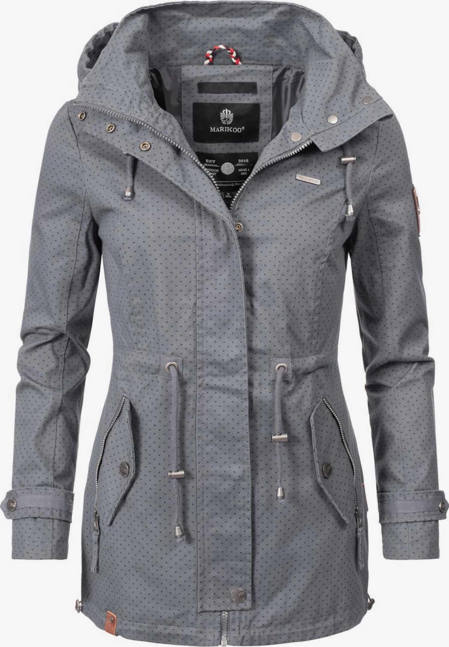 GestippeldKatoenAfneembare capuchonCapuchon met opstaande kraagCapuchon met trekkoordContrast voeringGetailleerd modelVerborgen ritsRitszakken aan de zijkantVerstelbare tailleTrekkoord in de boordAll-over patroonLabel patch/label flagOp staal nadenMetalen oogjesLicht gevoerdRitssluiting