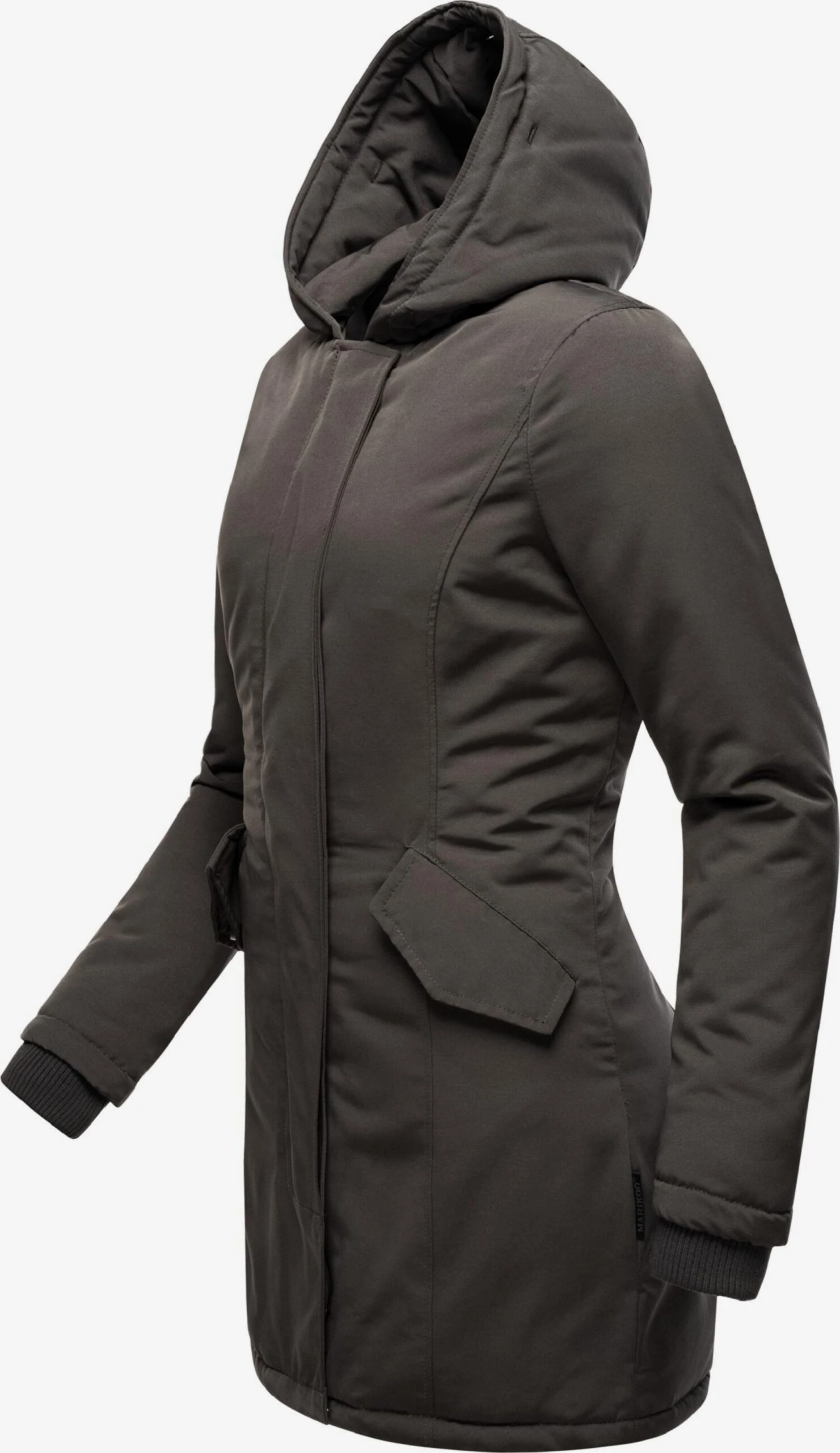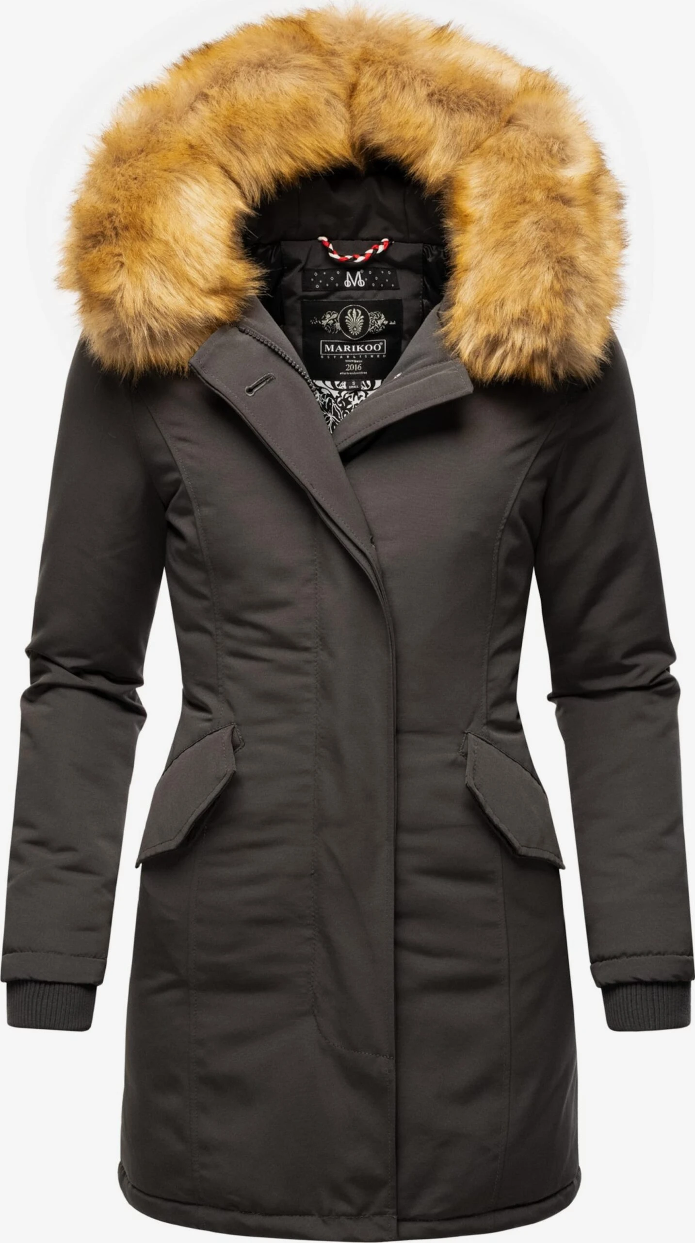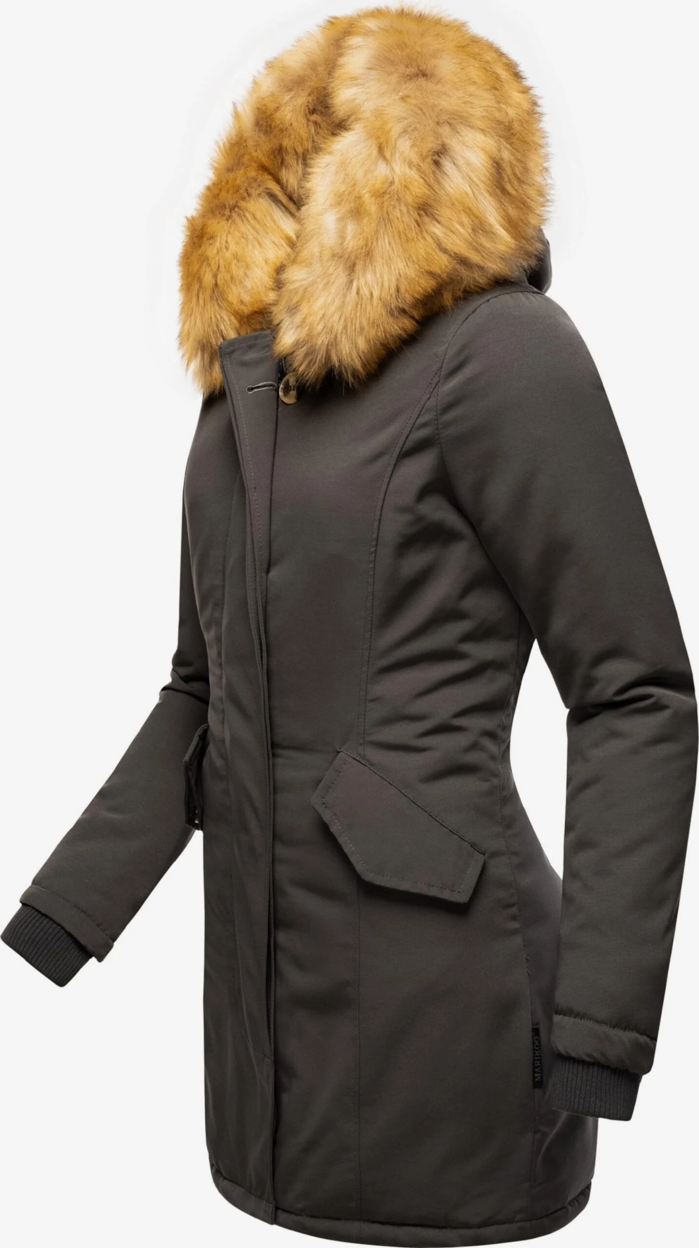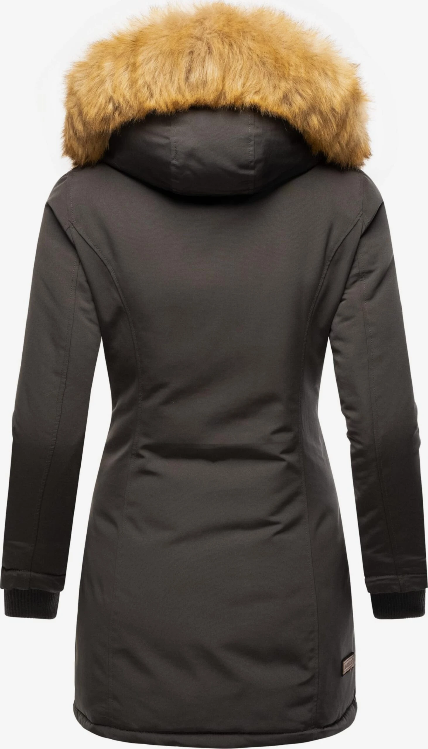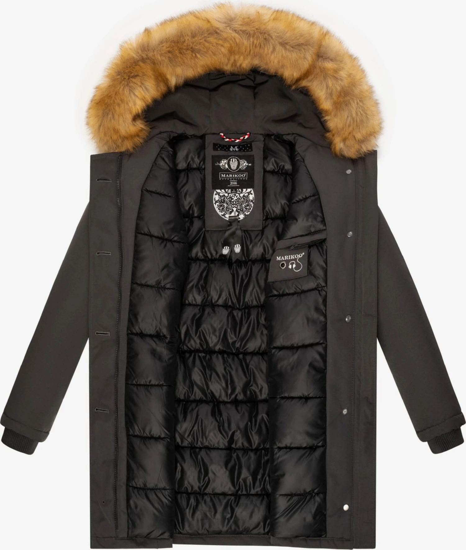 EffenGewatteerde jasRitssluitingCapuchon met afneembare nepbont kraagKnop placketContrast voeringGeribd ceintuurtjeGetailleerd modelBinnenzakOpzet-/flapzakLabel patch/label flagOp staal nadenWarm gevoerdRitssluiting