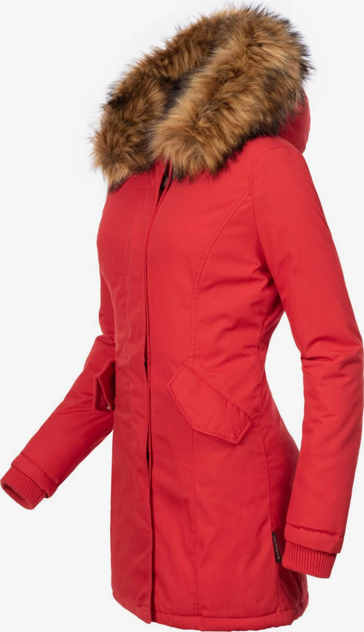 EffenKatoenCapuchon met afneembare nepbont kraagGeribd ceintuurtjeGetailleerd modelDeelnadenVerborgen knop placketVerborgen ritsBinnenzakOpzet-/flapzakLabel plaatjeLabel patch/label flagOp staal nadenZware stofWarm gevoerdRitssluiting